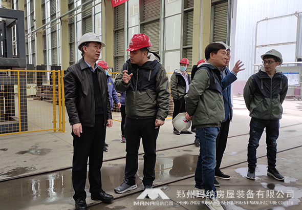 瑪納公司建有完善的“工業化房屋制造系統”裝備研發及產業化基地。在瑪納公司鮑總、許總及技術人員陪同下,崔琪院長、潘華主任、李清海主任參觀了瑪納公司上街區工業化生產基地,并對瑪納公司目前所做出的成績給予了高度的評價。鮑總、許總詳細介紹了瑪納公司加工設備及生產技術,各位領導認真聽取后對我公司現有的生產線和技術研發工作表示贊許和高度評價。