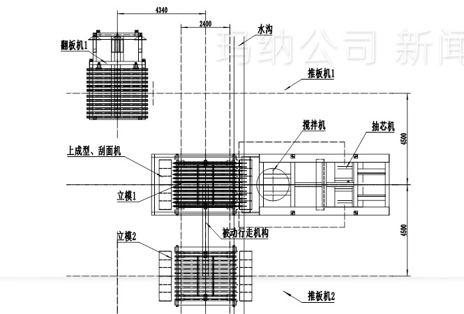 配置1號模車準備穿芯管,布網、澆筑,刮平,上成型,抽芯管等待出板;配置2號模車,出板,清模,涂油,合模操作,等待澆筑。兩個工位動作都完成后,交換位置,重復上述工作循環。