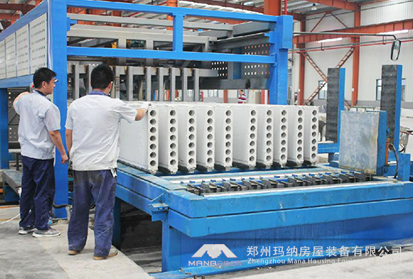 4. 立模墻板生產線的生產工藝流程為:原料計量配制、原料混和攪拌、穿芯、成組立模成型、靜放養護、抽芯、出模、碼垛。