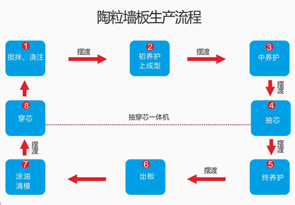 陶粒輕質(zhì)隔墻板生產(chǎn)設(shè)備主要包括:墻板成型機(jī)、全自動(dòng)輕骨料混凝土攪拌站、澆注系統(tǒng)、抽管系統(tǒng)、自動(dòng)出板機(jī)、配套設(shè)備,生產(chǎn)線特點(diǎn)如下: