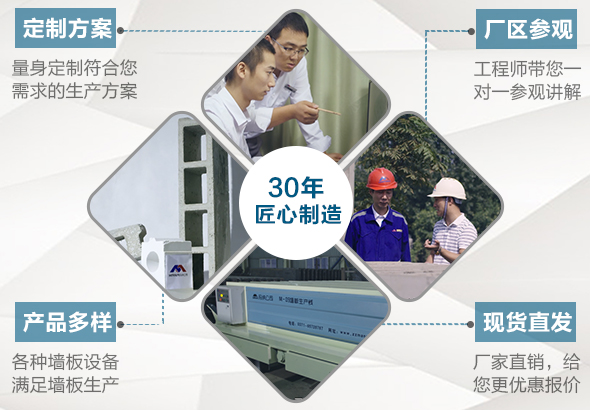 作為墻板生產設備廠家的瑪納公司,為了更好的服務好客戶,生產的輕質墻板機械設備優勢非常強悍,結構設計、性能優化充分考慮到不同用戶的需求,可同步滿足不同的作業要求,敿{公司可以根據客戶的工藝流程進行生產工廠規劃,生產線設計,選擇瑪納公司不會讓您失望,歡迎隨時來電咨詢或來廠參觀。