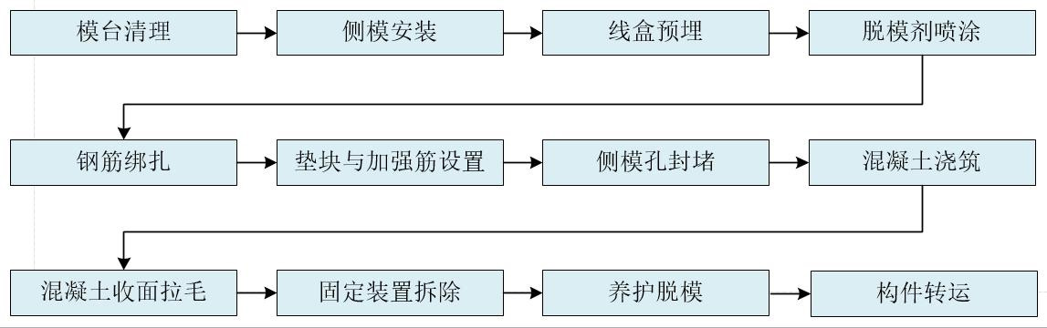 疊合板生產采用模臺流水線生產,模臺可整體移動,不同區(qū)域負責不同工藝,每道工藝完成后,模臺移動到下一個區(qū)域。疊合板生產流程如下: