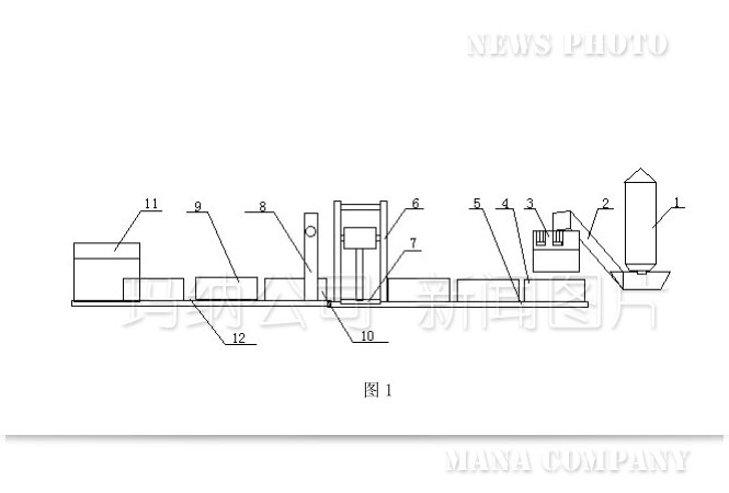 通過攪拌混料裝置1將水泥、沙子混合后再通過輸送裝置2輸送至下游的的高壓注漿裝置3,高壓注漿裝置3是將混料通過高壓注漿器注射至接受箱4內,再經過接受箱循環移動裝置5的循環移動,其上的接受箱4內的無極水泥、沙子、發泡劑、粘結劑在一定時間內膨脹且凝固成模塊8,再通過起膜裝置6使接受箱4內的所述模塊8與所述接受箱4脫離,通過推進裝置7將脫離接受箱4的模塊10推至下游的切割裝置8,脫離后的接受箱4可在接受箱循環移動裝置5上繼續循環使用,模塊8通過下游的切割裝置7切割成一定規格的保溫板9并通過分支輸送裝置12送至發泡保溫板包裝機11上進行包裝,實現了阻燃效果好,自動化程度高,生產成本低,生產效率高的效果。