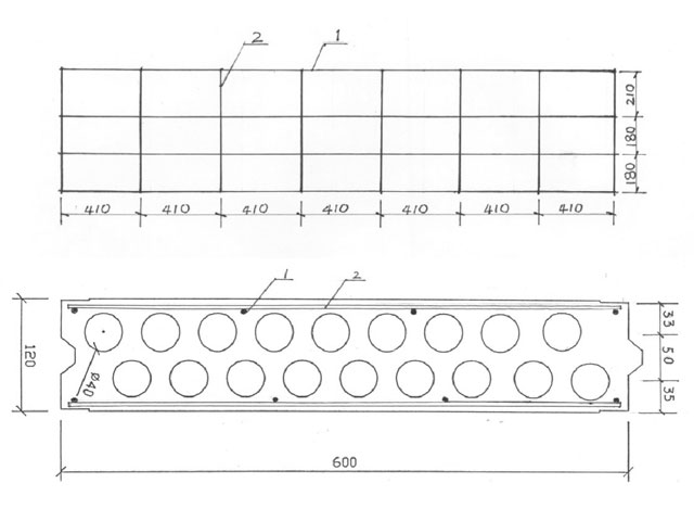 以我公司生產的厚度120mm板(寬度600mm,長度2900mm)為例,鋼絲網用縱向鋼筋4根、橫向箍筋8根焊接而成。要正確設置縱向鋼筋的位置,4根縱向鋼絲不是等距離的,間距分別為210mm、180mm和180mm,使之盡量嵌于兩個圓形芯孔的中間位置附近,從而避開芯孔邊緣面層的最薄端。這樣鋼絲的內外保護層可以顯著增大,而對橫向箍筋的布設沒有限制,均勻布設即可。