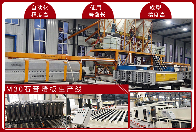M30石膏墻板生產線是瑪納公司在最新研制機動成組立模墻板成型工藝的基礎上,引進國外先進石膏墻板生產工藝,經過技術創新,研制出的新型石膏墻板生產線,具有如下特性: