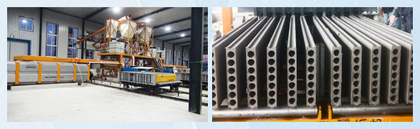 4)上面成型及出板系統(tǒng):完成澆注成組立模后,由上面成型機成型上平面,等養(yǎng)護完成后,開模,再由出板機把成型板推出,以供打包。