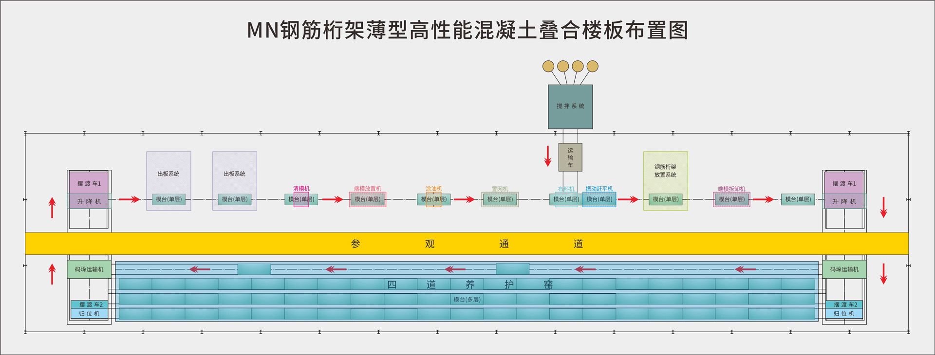 1.功能主機模塊(出板系統、清理系統、自動端模系統、涂油系統、網片布網切割系統、精準布料系統、整平系統(含毛面處理)、桁架定位置入系統)。